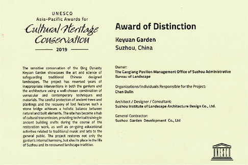 2019年 集团主持的可园修复项目获2019年度亚太地区文化遗产保护大奖——杰出奖。这是苏州在文化遗产保护方面由政府间国际合作组织颁发的最高奖项,也是苏州园林首次获得联合国教科文组织文化遗产保护奖。